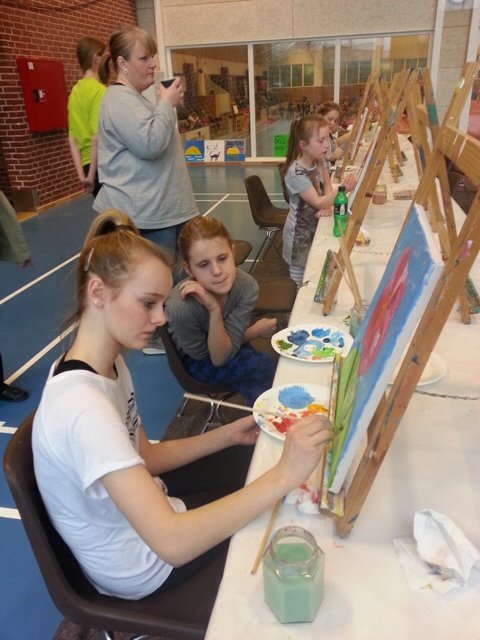 I skolen er der både bord og gulv staffeli. Vi medbringer selv plast til bordene og malergrej - Vi starter som regel med eftermiddags kaffen